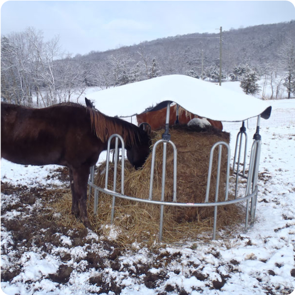 Protects Your Hay: Shields hay bales from rain and snow, preventing soggy, spoiled hay and reducing waste caused by animals pulling off wet layers. No more frozen solid bales overnight! Improves Animal Health: Unlike fully enclosed feeders, the open design reduces hay dust inhalation risks, promoting better respiratory health. Maintains Hay Ring Functionality: Keeps your hay ring easy to move—roll it by hand or use equipment like a front loader or our Bale & Ring Mover Spear.